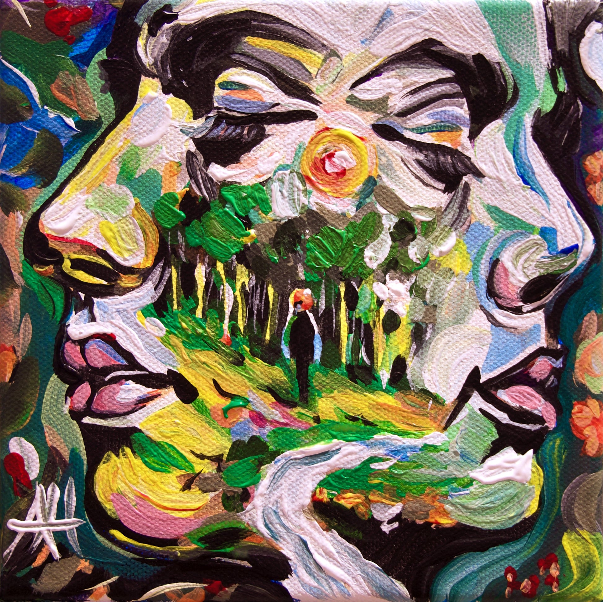 - Dreamwalkers Acrylic on canvas | 7" x 7" x 1-1/2" | Floating frame In Dreamwalkers, figures emerge softly from a layered, abstract dreamscape—suggesting movement through subconscious terrain. This intimate acrylic painting is part of my Interiors series, which explores the emotional and spiritual landscapes within. Gentle hues of rose, violet, and earthy golds drift across the surface, giving the piece an ethereal, almost otherworldly quality. The subtle linework hints at presence and passage—souls in motion, traveling the liminal space between sleep and awakening. Framed in a floating frame, this piece invites quiet contemplation and connection to unseen realms.