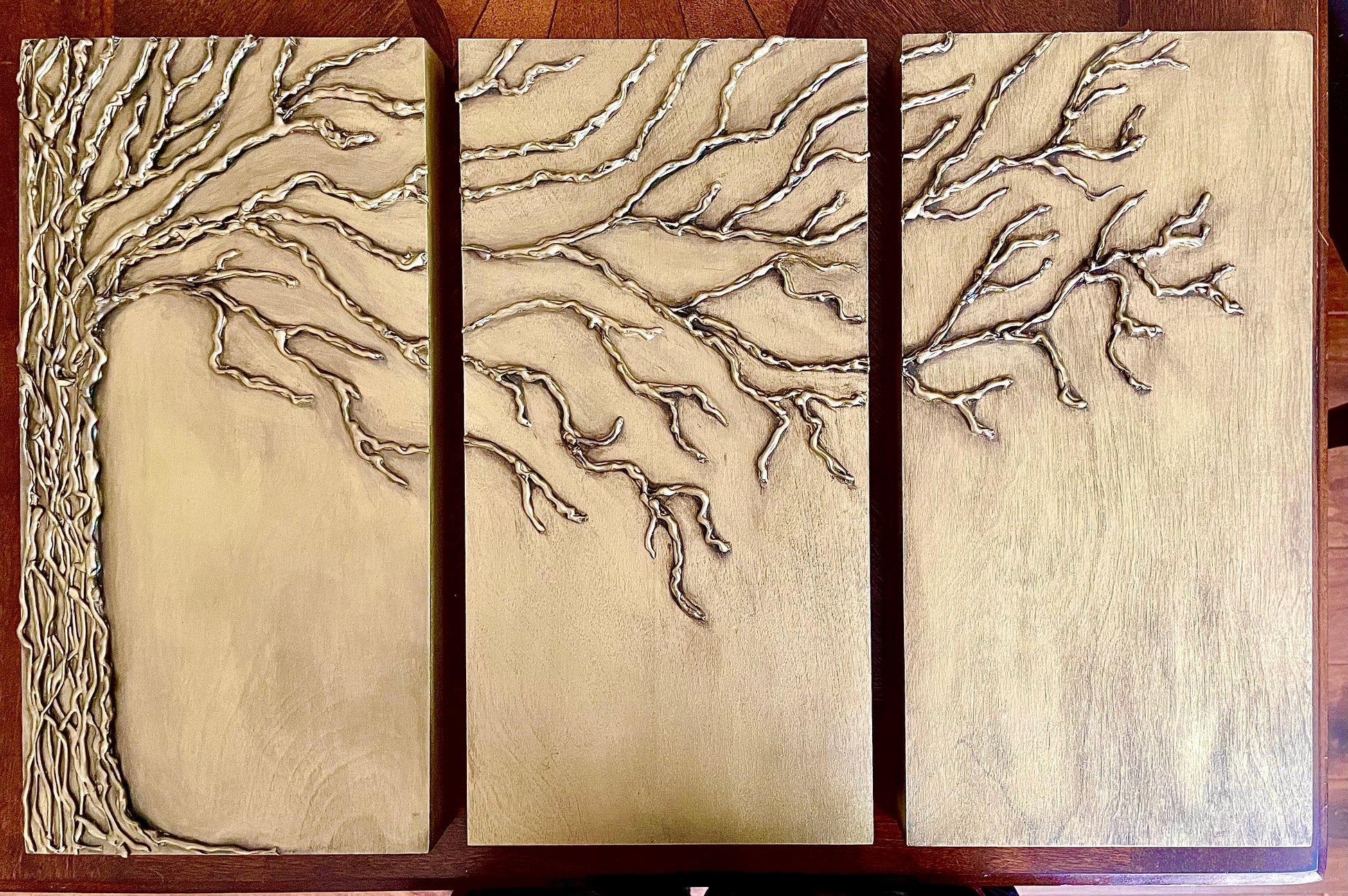 - Triptych, 3-8x16" cradled birch panels, acrylic, glue and modeling paste, ready to hang