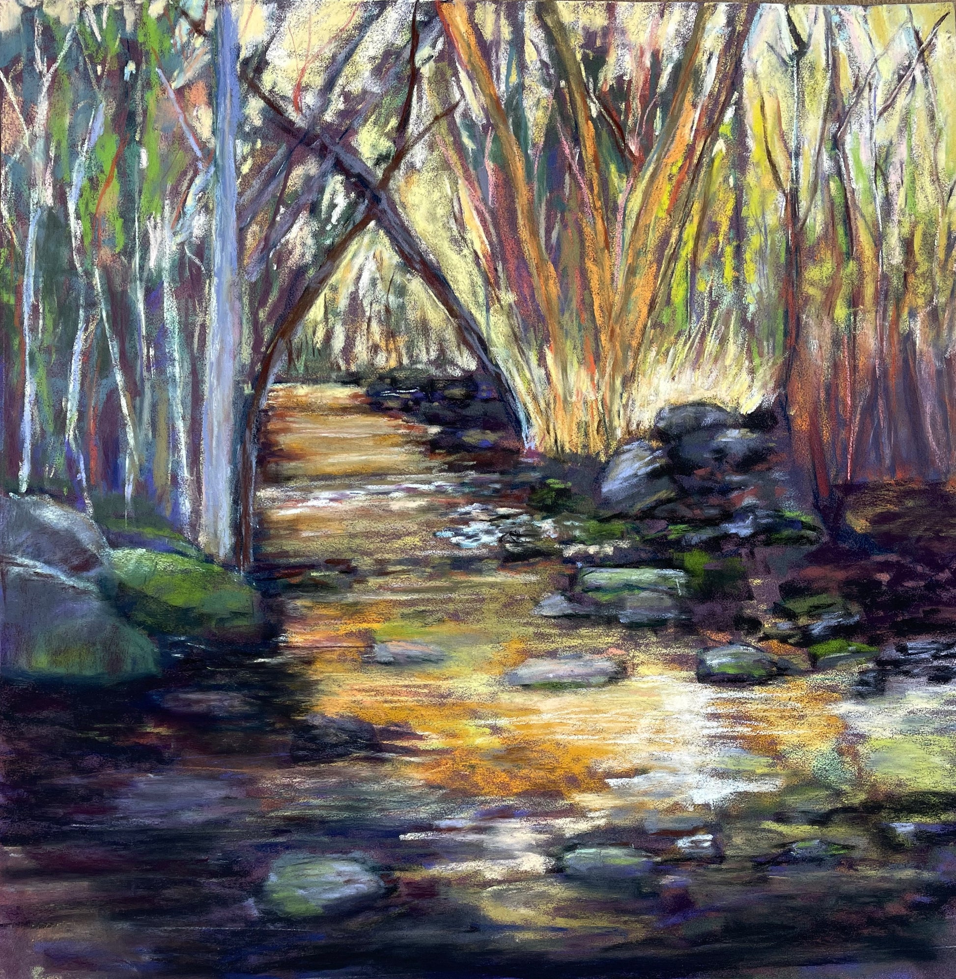 - 14x14 , framed in black with silver inlet. Museum glass. Painted at Lithia Park, Ashland, Or