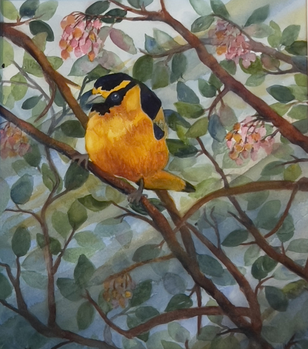 - 19" x 17" A grosbeak bird in a manzanita tree.
