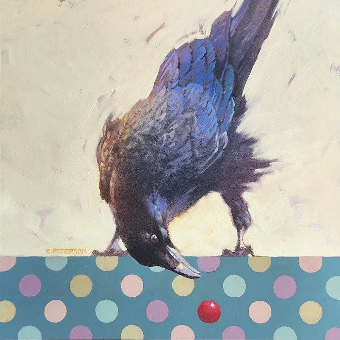 - 12"x12" Crow eyeing red fruit coming up through ground.