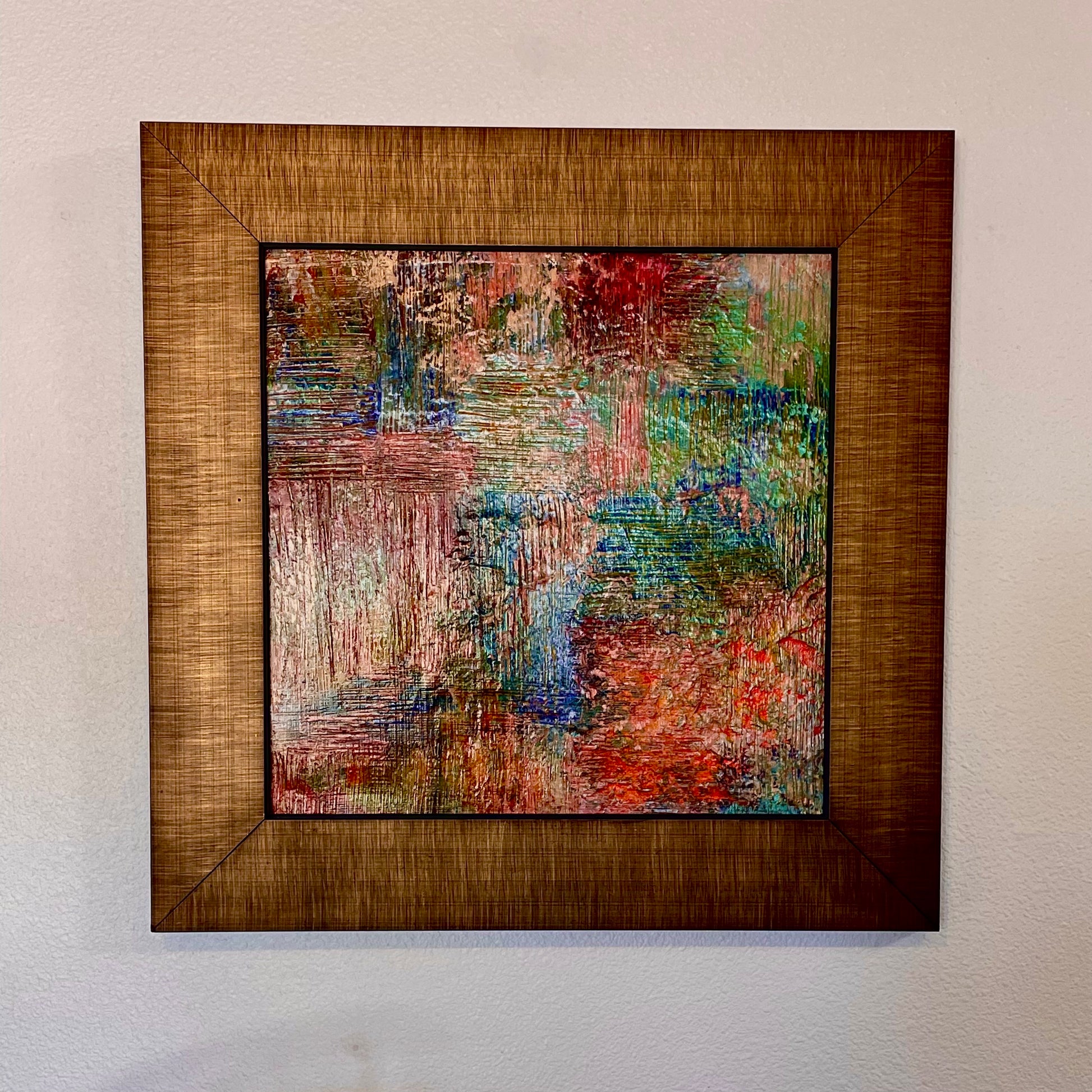 - 16x16" image size, washi paper covered metal panel, 3 ¼ wide frame, ready to hang