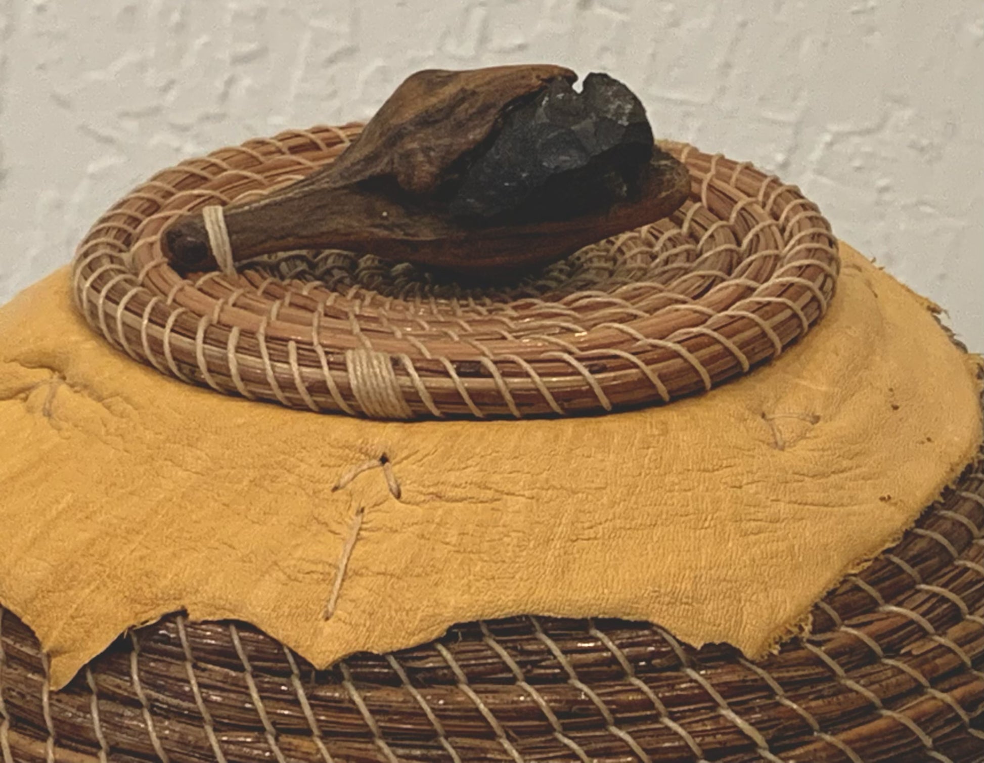 - When I'm fishing I'm always looking for objects to collect. I found this arrowhead along the Upper Rogue. It fit perfectly into a piece of driftwood I had. I thought of the Native Indians that might have fished here once, so I added a wrap around the top with buckskin. The needles are softened and aged in the oven. The basket is sewn with natural Irish linen thread and coated with a natural shellac to seal and preserve the finished basket.