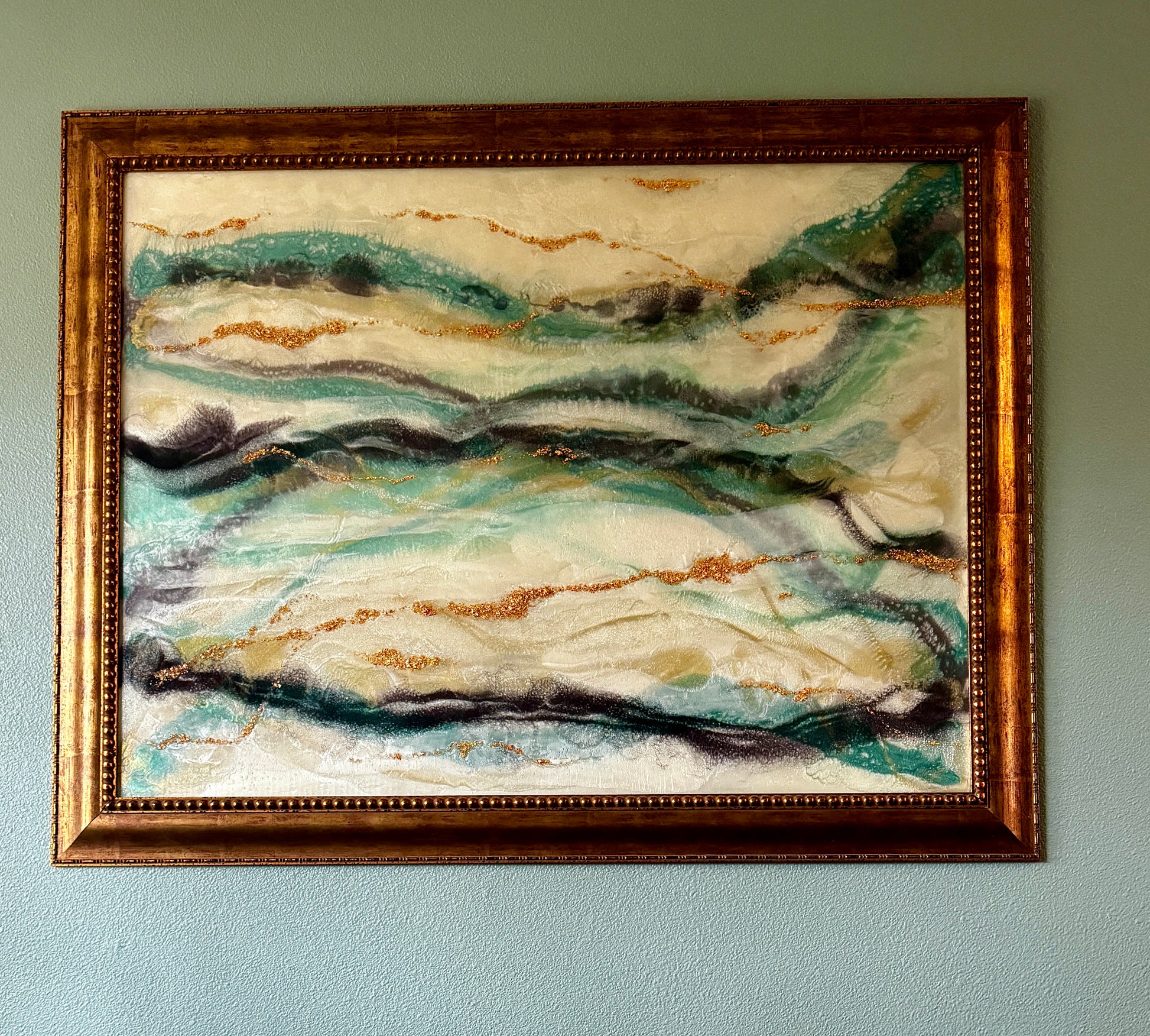 - 55x43" layered metallic and pearlescent pigments in resin with a backing of holographic film. Gold leaf embedded to resemble mineral stratification. Framed, ready to hang.