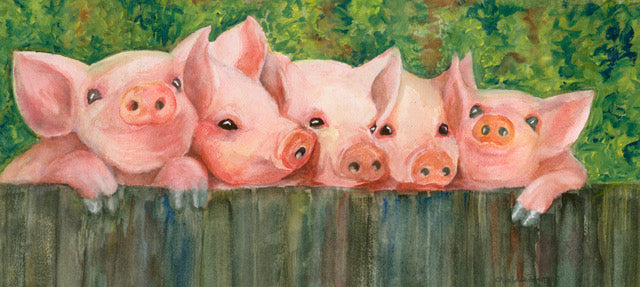 - Five piggys hanging over a fence