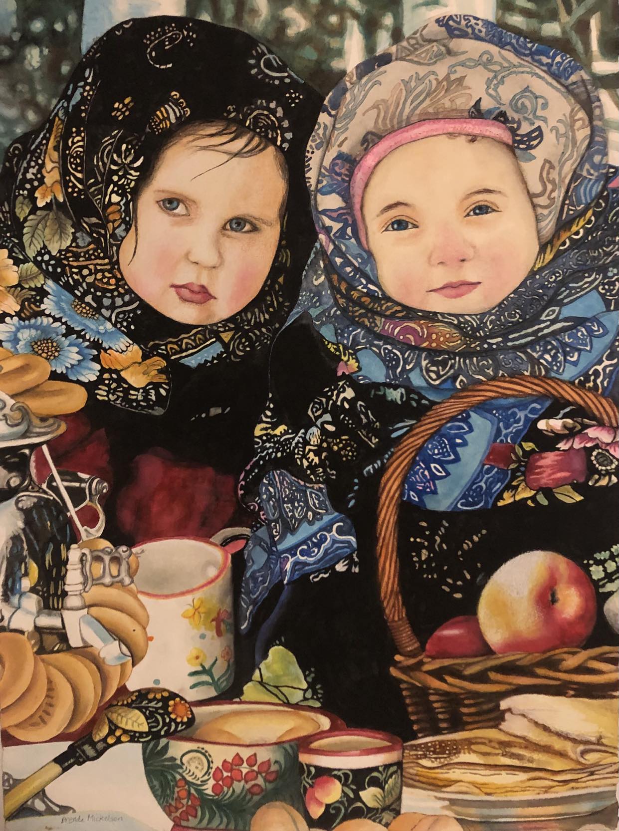 - 22/30 inches Watercolor of two young Ukraine girls in their traditional colorful scarves with various food in the pictures